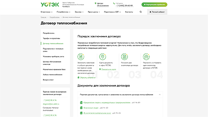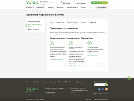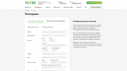 • Личный кабинет по теплоснабжению физических и юридических лиц, где пользователи могут получать информацию о заключенных с АО «УСТЭК-Челябинск» контрактов, передавать показания индивидуальных приборов учета, отслеживать расчёты (начисление, оплата, перерасчёты, задолженность).