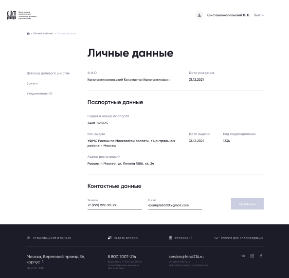 • После авторизации по номеру телефона и ввода уникального кода все данные автоматически заполняются из системы Фонда 1С:УП.