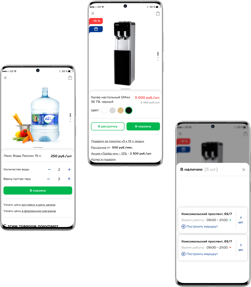 Подробная карточка товара обогащена лентой фотографий товара, несколькими вариантами цены, которая зависит от дня доставки и от количества товаров, а для некоторого вида товаров отражены остатки в фирменных магазинах.