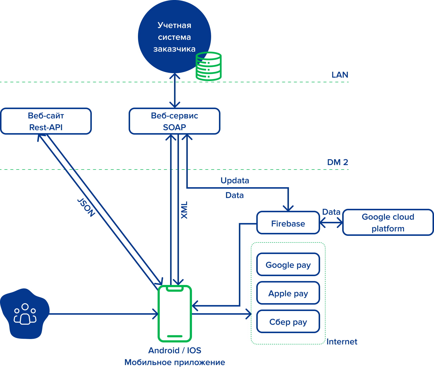 В мобильном приложении настроена двусторонняя интеграция с учетной системой клиента и с Firebase для отправки push-уведомлений